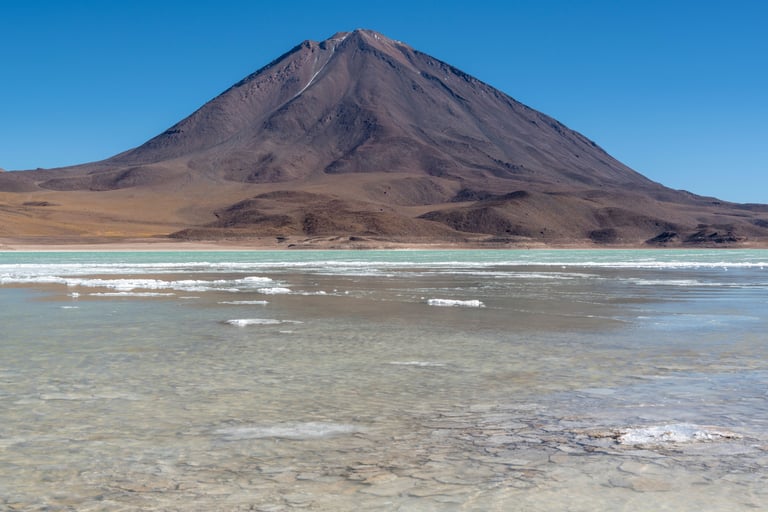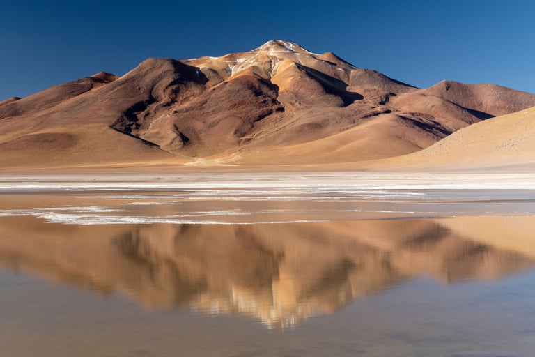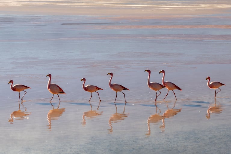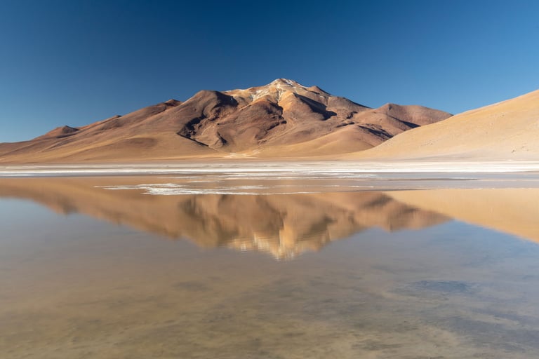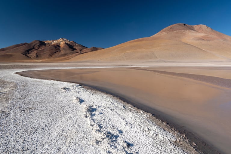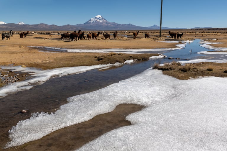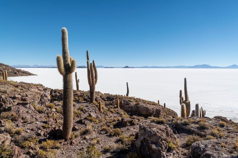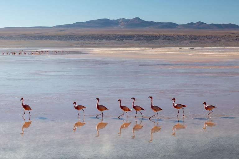 Bolivia's salt flats, primarily the vast Salar de Uyuni, are the world's largest salt pan, a surreal, white expanse formed from prehistoric lakes on the Altiplano, famous for mirror-like reflections in the wet season, optical illusions, and unique sights like cacti-covered islands and a train graveyard. Salar de Uyuni is one of South America’s most phenomenal attractions. The vast expanse of white, glistening salt stretches across 10,582 kilometers of the Altiplano and can even be seen from space. Layers of salt are sandwiched between sedimentary deposits that reach a great depth of 10m in the centre of the flat. Laguna Colorada, (translated to Red Lagoon), is a shallow, hypersaline lake in the remote southwestern region of the Altiplano, within the Eduardo Avaroa Andean Fauna National Reserve in Bolivia and located at an elevation of approximately 4,278 metres (14,000 ft) above sea level