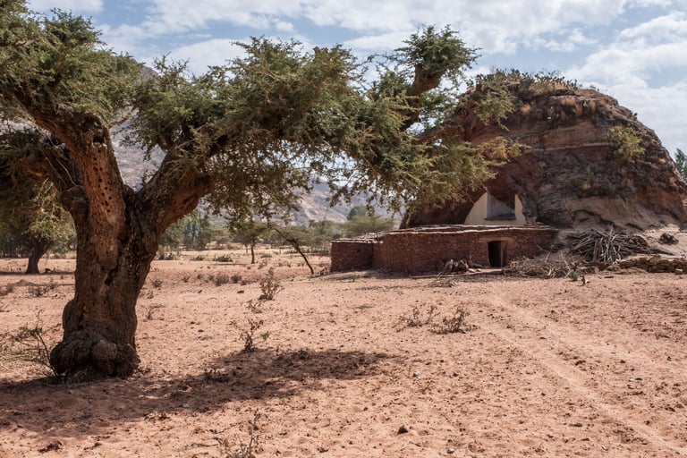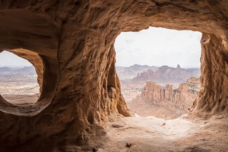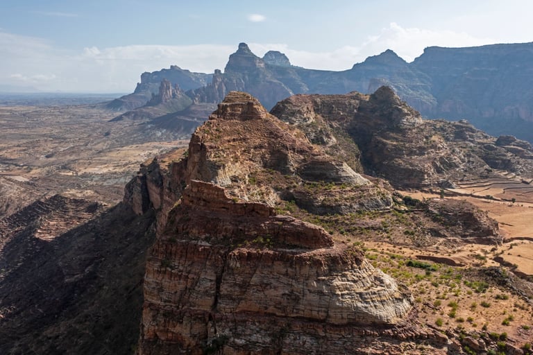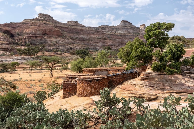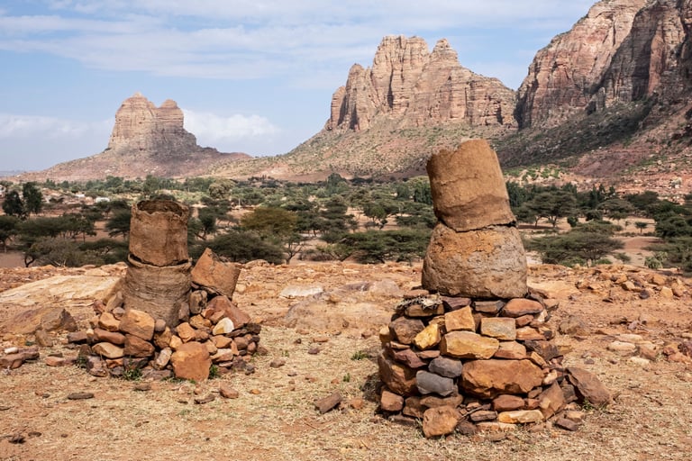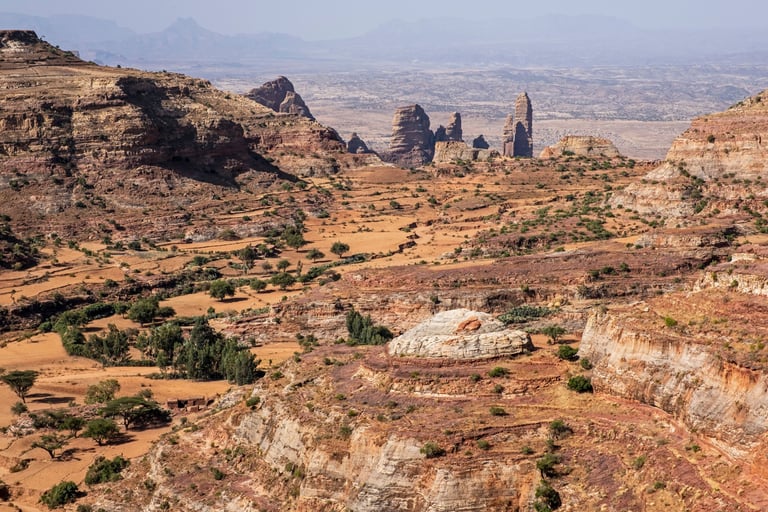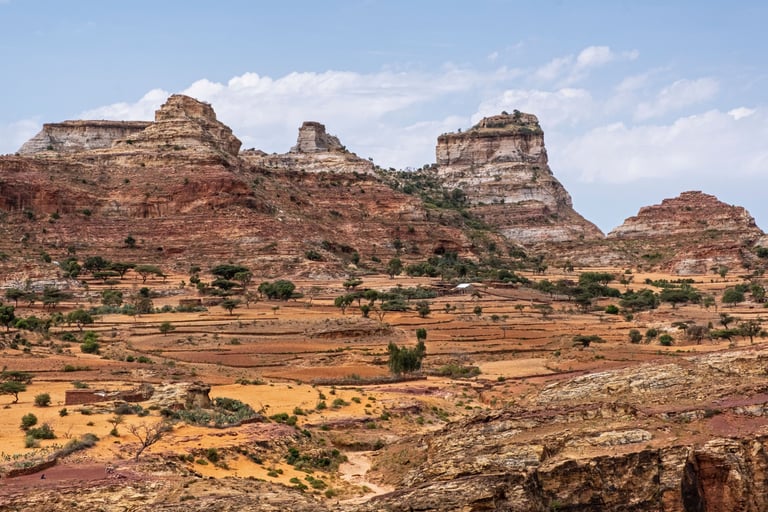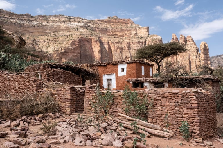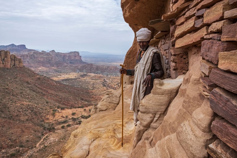 The Gheralta Mountains in Ethiopia's Tigray region are famous for their dramatic sandstone cliffs, ancient rock-hewn churches (like Abune Yemata Guh, Maryam Korkor), and opportunities for adventurous trekking, offering a unique blend of stunning scenery, early Christian history, and cultural immersion with local villages, making it a prime destination for hikers and history enthusiasts