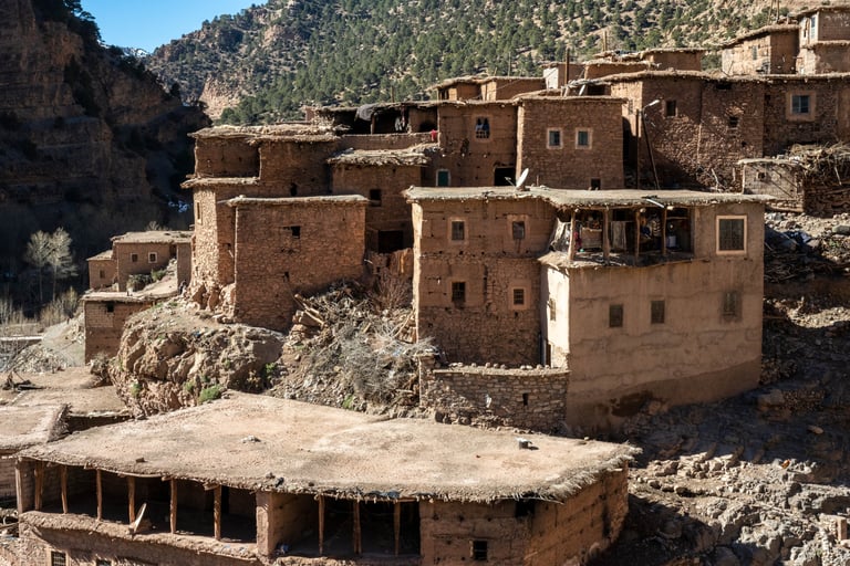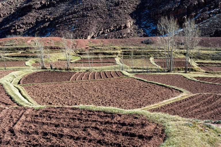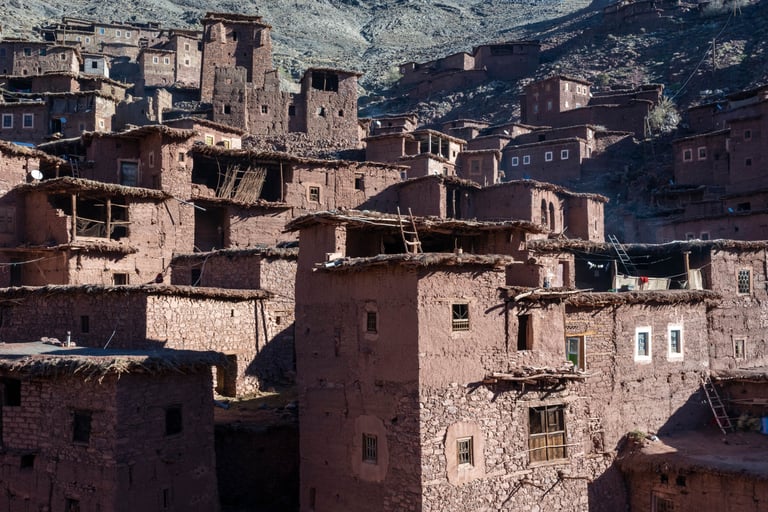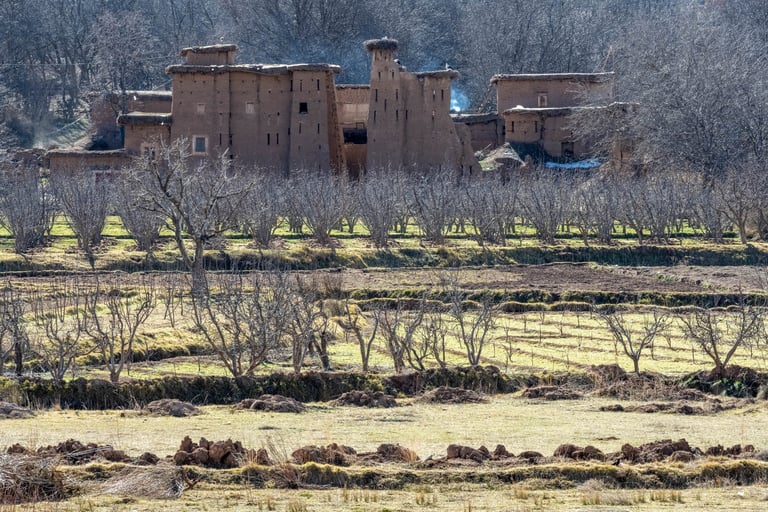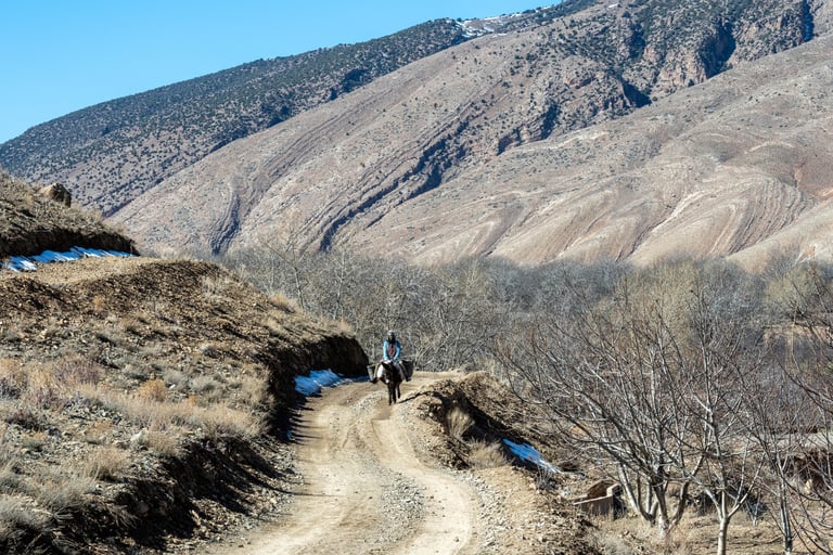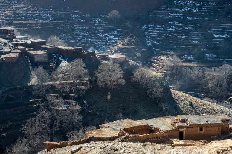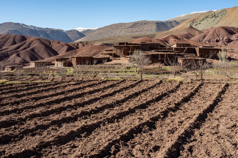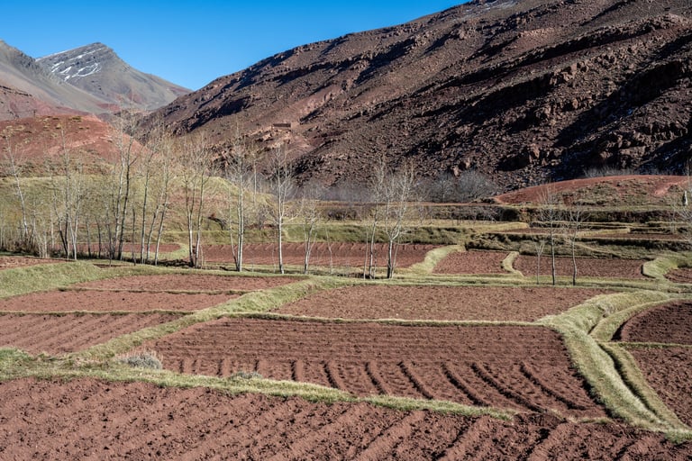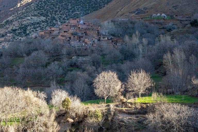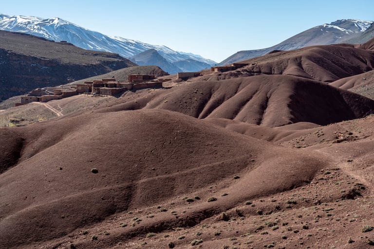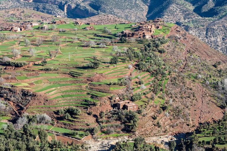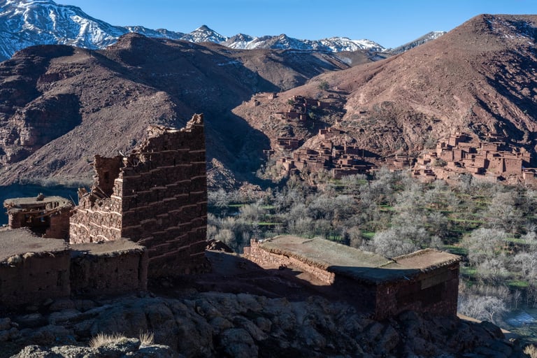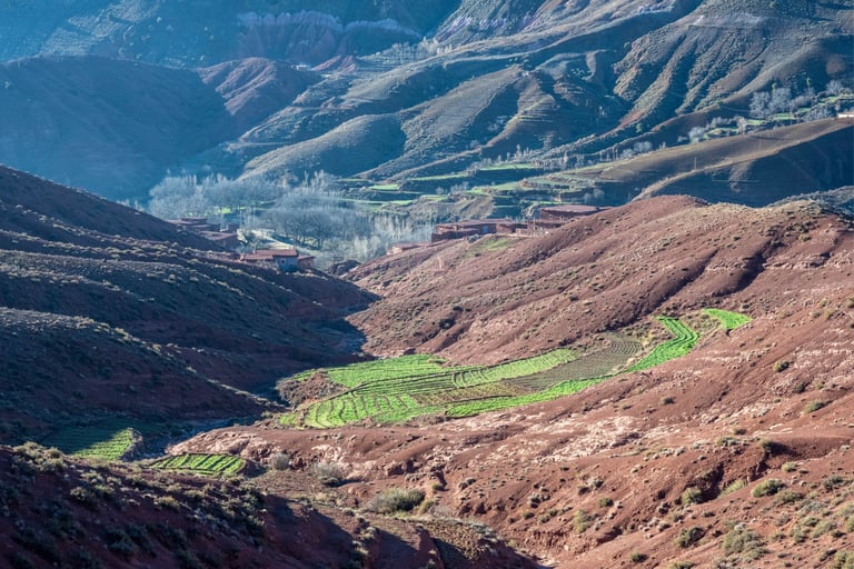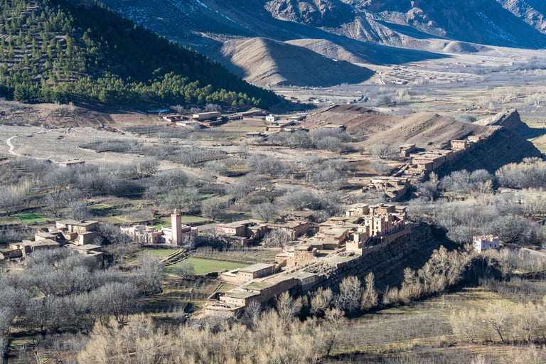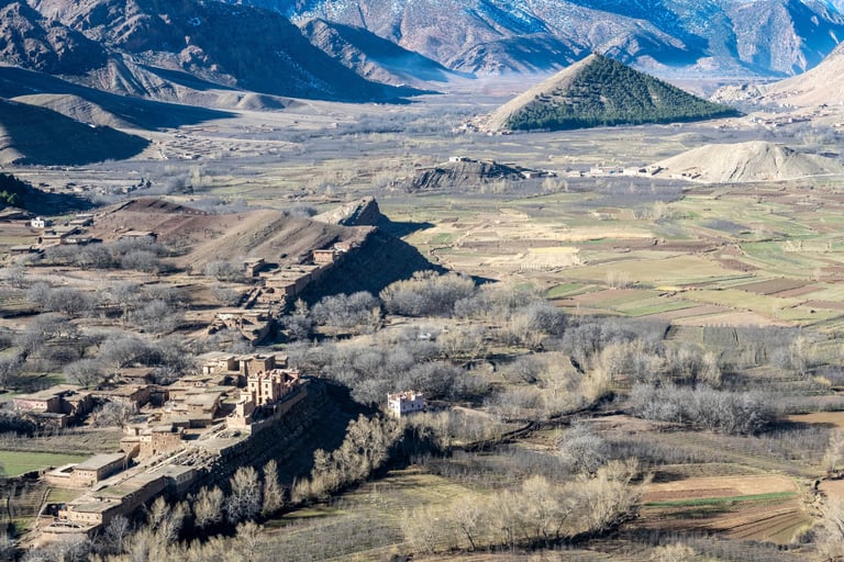 M'goun Massif Trek in Central High Atlas starts in the beautiful valley of the Ait Bougemez. You enjoy the majestic scenery of these rugged mountains, but also the friendly and fascinating culture of the indigenous Berbers. It is a wild area, which has a more simplistic tourist infrastructure. In many ways however the scenery is very magnificent with extensive terracing, green broad valleys pierced with irrigation canals, areas of walnut copses, strange rock formations and colours, with the berber villages clinging to the mountainsides.