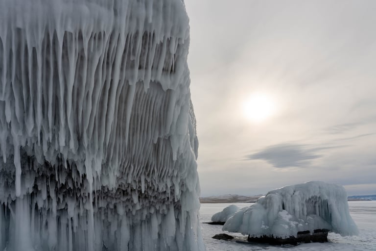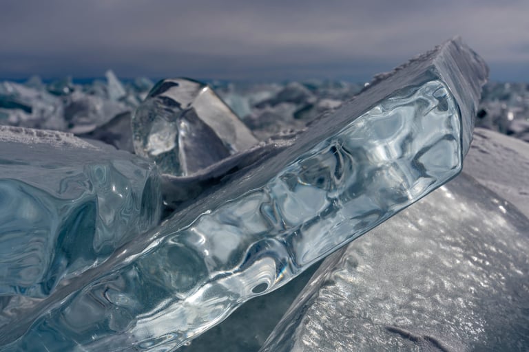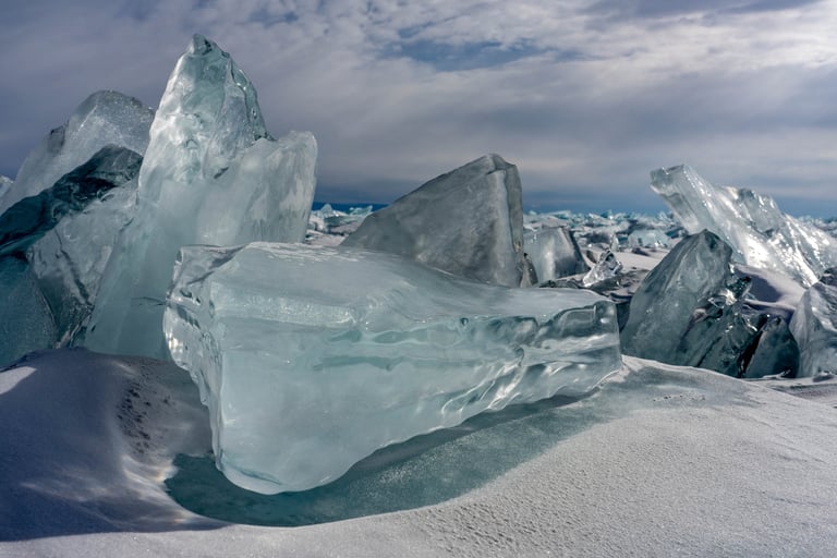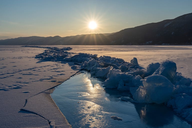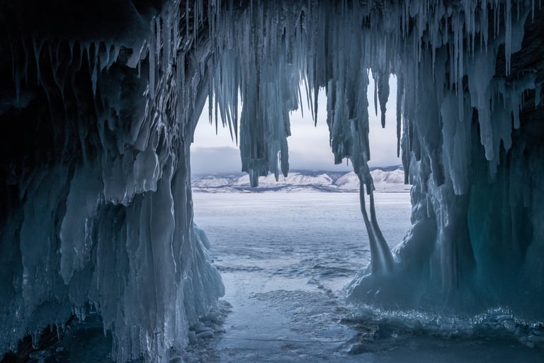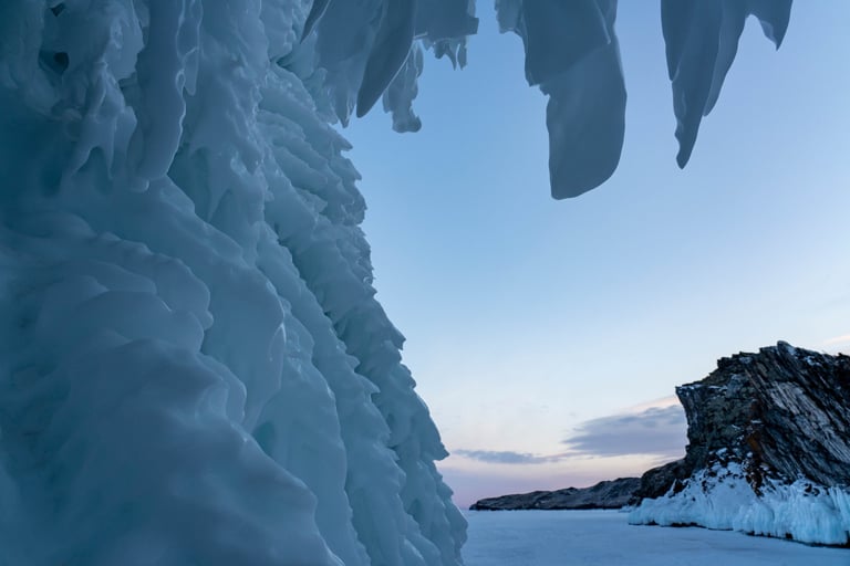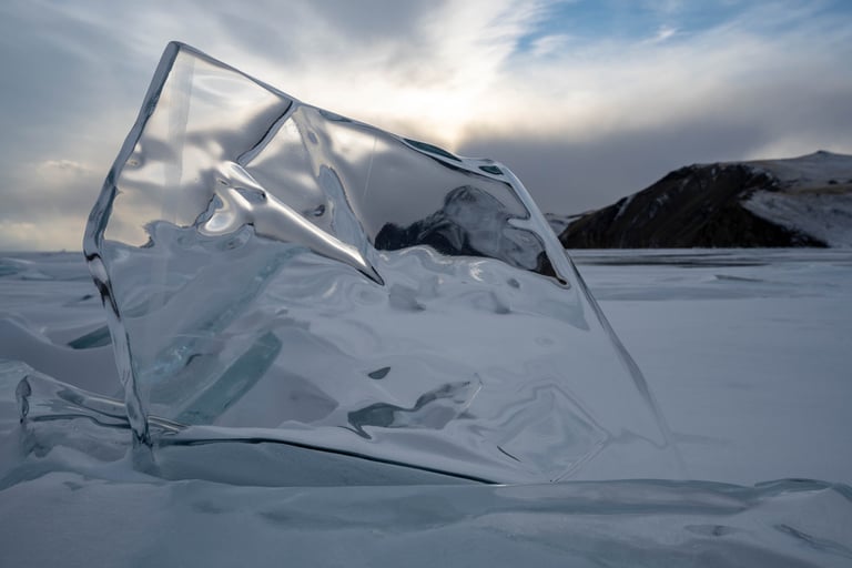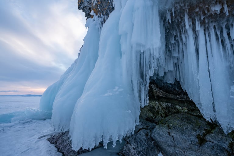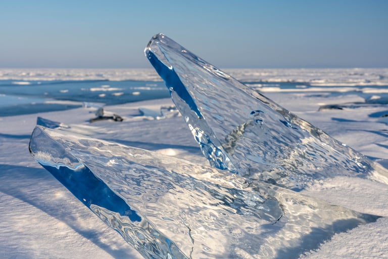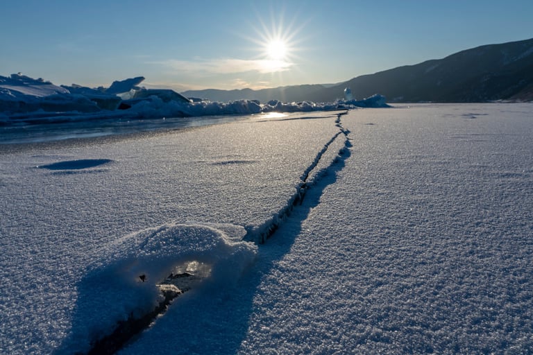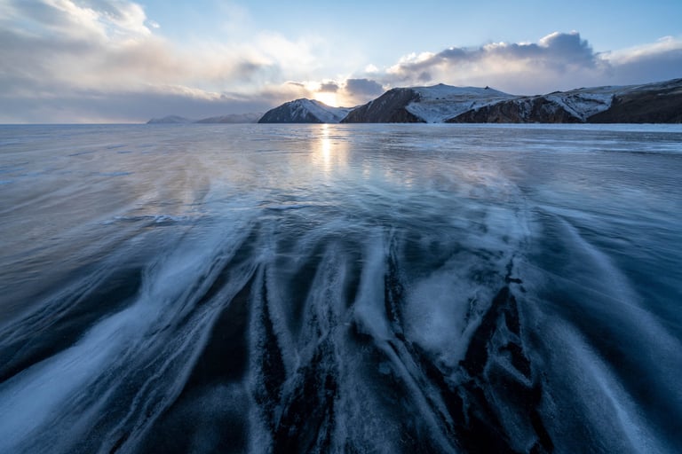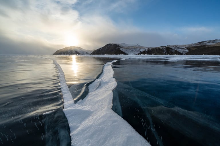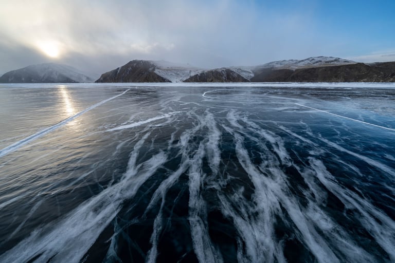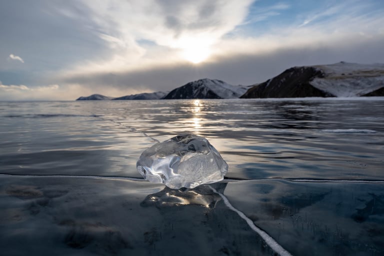 Baikal lake is situated in southern Siberia, Russia. Lake Baikal is in a rift valley, created by the Baikal Rift Zone. At 636 km long and 79 km wide, Lake Baikal is the deepest lake in the world at 1,642 metres . The lake is surrounded by mountains; the Baikal Mountains on the north shore, the Barguzin Range on the northeastern shore and the Primorsky Range stretching along the western shore. Baikal is especially beautiful in winter when it is covered with blue ice.